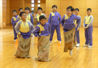The first is called “Egg and Spoon Race,” where children need to run over and between obstacles while balancing a boiled egg on a spoon. At the end of the obstacles they needed to answer an English question and return back to their team. By the end of the game there were many smashed eggs on the floor and children giggling with laughter!