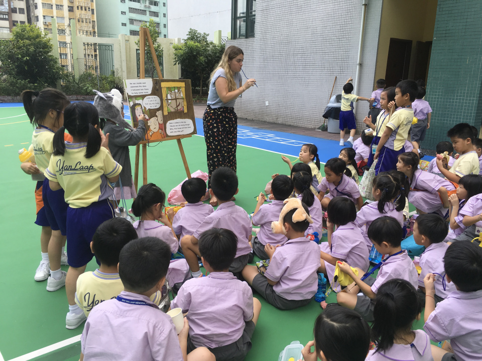 Miss Caroline and Miss Aimee run an English Storytelling program every day at first recess. She reads English picture books on the covered playground while students use puppets to act out the story! Last week Ms. Caroline read a book about a witch called Winnie, a pink dolphin, and a guinea pig looking for food. Her favourite book to read is Little Red Riding Hood because she can pretend to be a wolf! She also loves Goldilocks and the Three Bears.