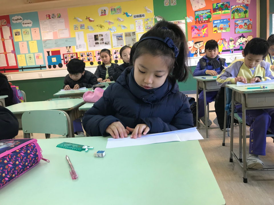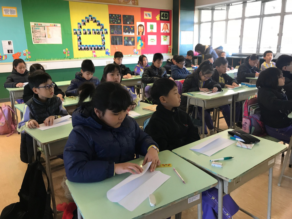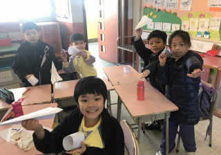 三、四年級的同學以一張 A4 紙摺成紙飛行環,利用物體旋轉時,產生的旋轉軸,於投擲前進時,依旋轉軸方向飛行前進。