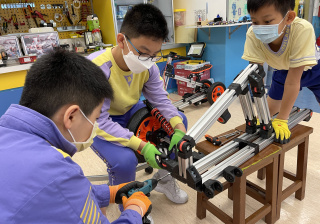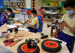 6E 林朔舜 同學三人自行組裝電動高卡車,由裝配車架、接駁電機、焊接電線到測試及改裝,三人一起進行測試及改良,並製作兩台不同的車架作測試及比對,以改良出最高速的車輛。