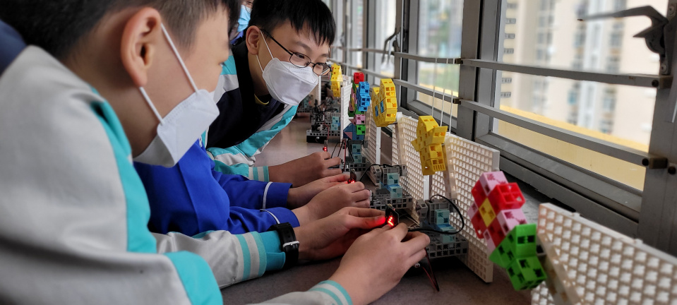 六年級同學利用MICRO:BIT編程,結合組裝積木,由同學自行創作及設計互動積木,稍後更將互動積木配置於地下之積木牆上,讓其他同學於小息時作互動遊戲。