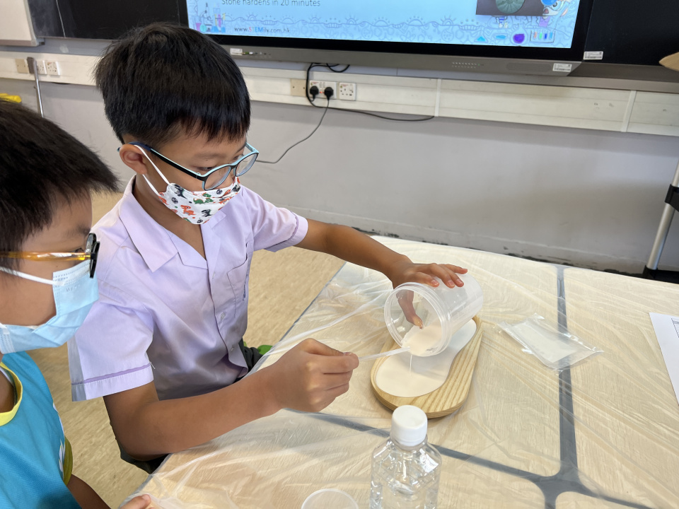 四年級同學透過動手做去學習鑑證科學,以培養科學探究精神。當中有抽取食物DNA、製作鞋印模型和套取指模的實作活動。