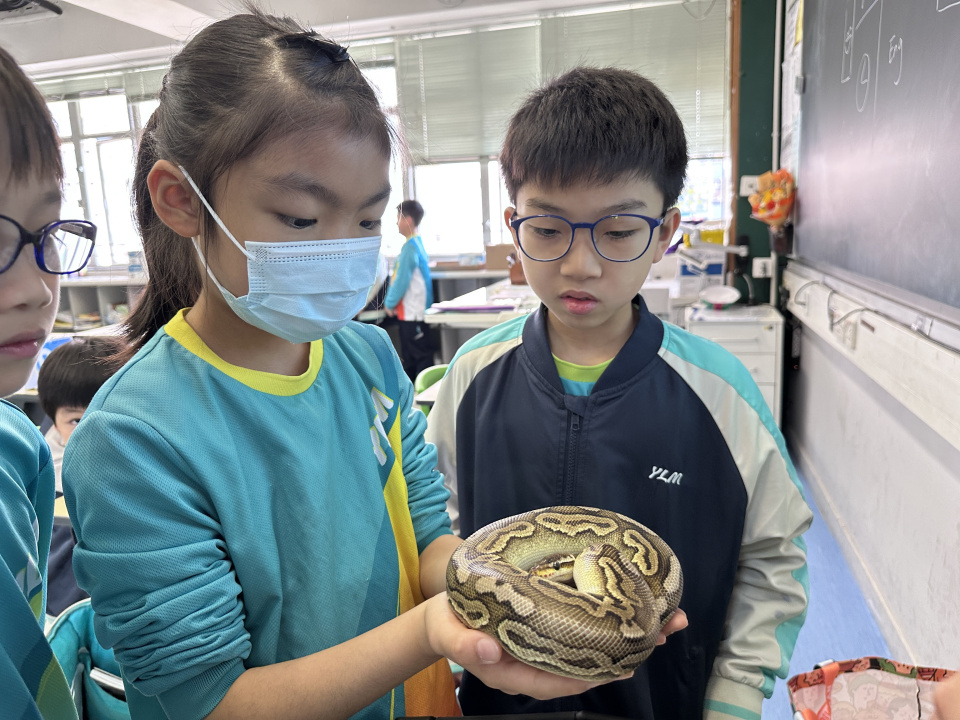為配合四年級科學科生物世界的學習單元,本校特安排小樹林教育機構到校,為學生進行兩棲爬行全接觸的學習活動,活動除了有專業人士講解本地兩棲類及爬行類的生態外,亦讓學生可親身接觸「蟒蛇」這種爬行類動物,加深對動物的了解,從而理解動物的身體特徵。