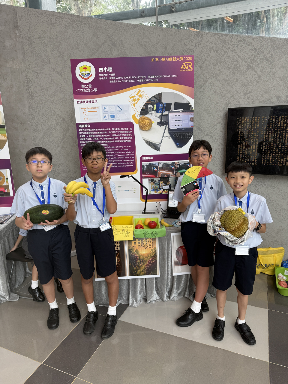 本校4位同學組隊(隊名:四小糖)於2025年6月-8月期間參加了由愛動智 EduAIR 舉辦的「全港小學AI創新大賽2025」,他們為了人們的健康著想,設計了「智能水果糖分監測裝置」來參賽。他們的作品經專業評審團評選後,成功晉級準決賽,能夠於8月28日在中文大學進行展示、演講及晉身最後10強作最後滙報。他們最後獲得評判讚賞,頒發優異奬及書劵。