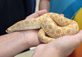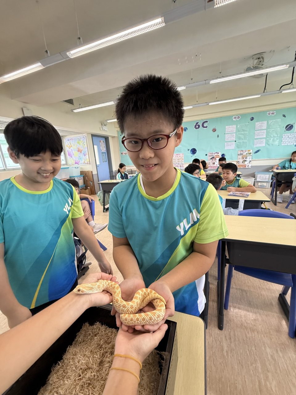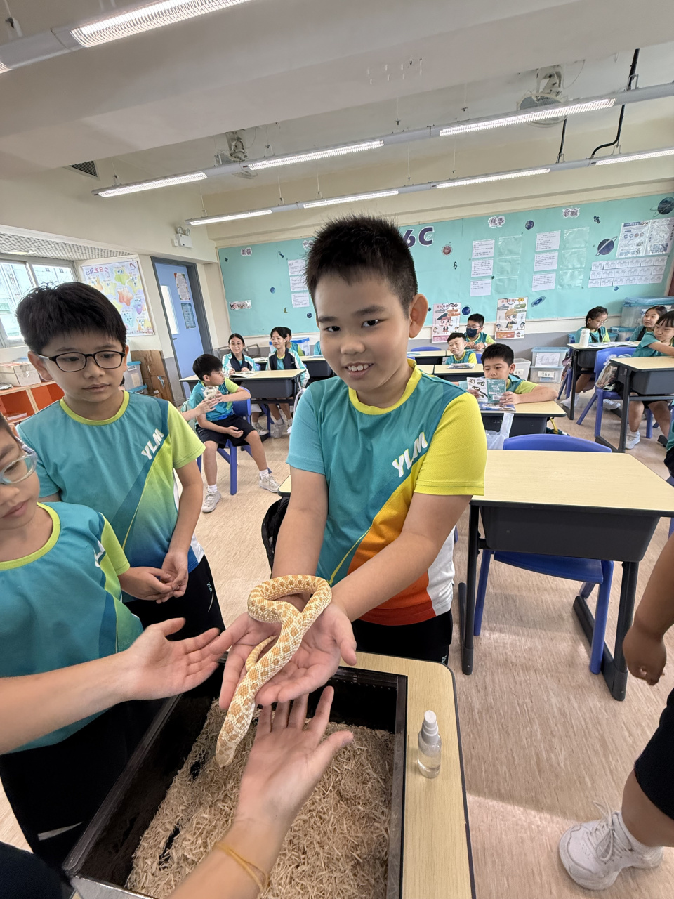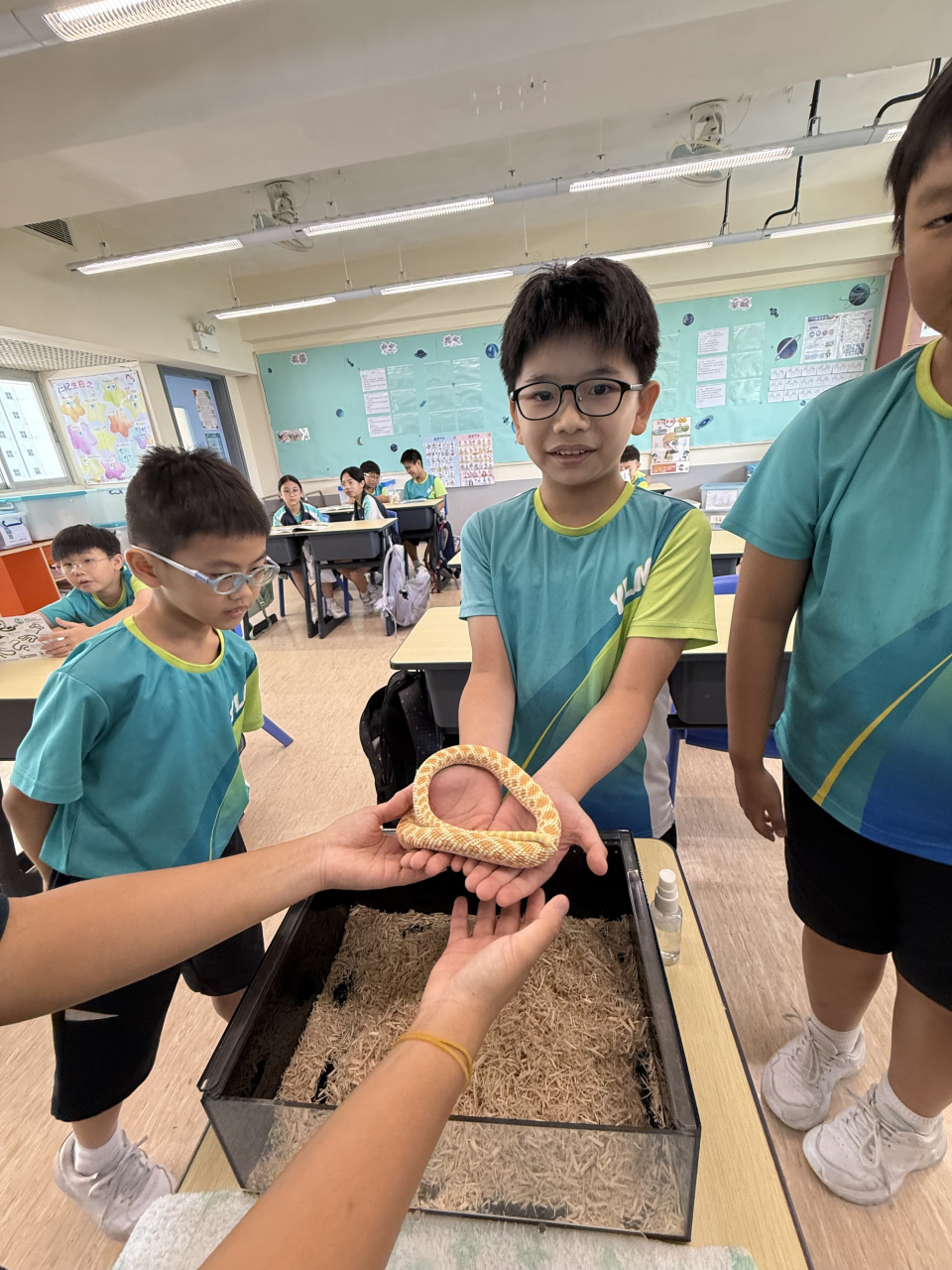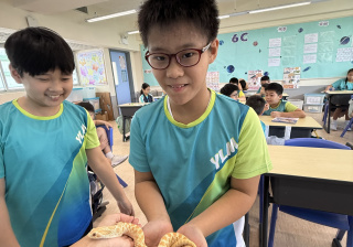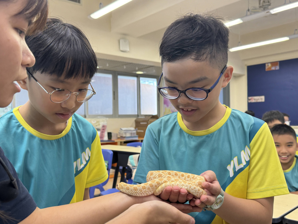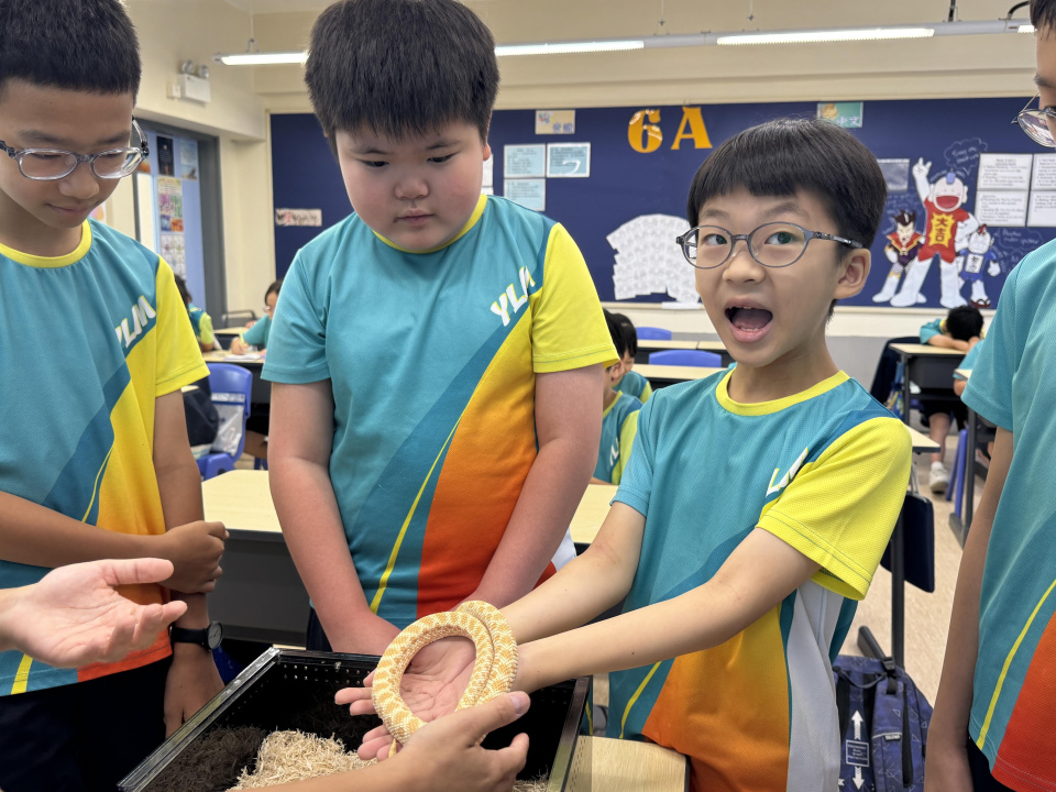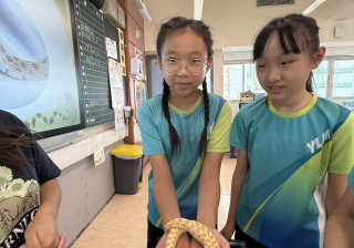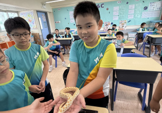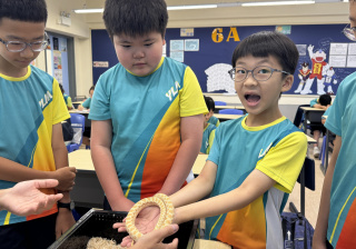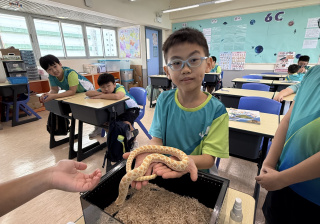 同學表現雀躍,主動抱蛇觀察!透過分組研習本地生態,將科學知識結合愛護動物的價值觀,實踐真正的體驗式學習。