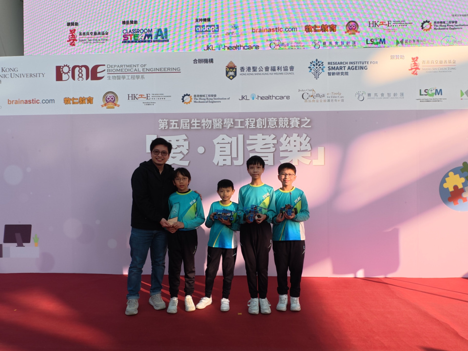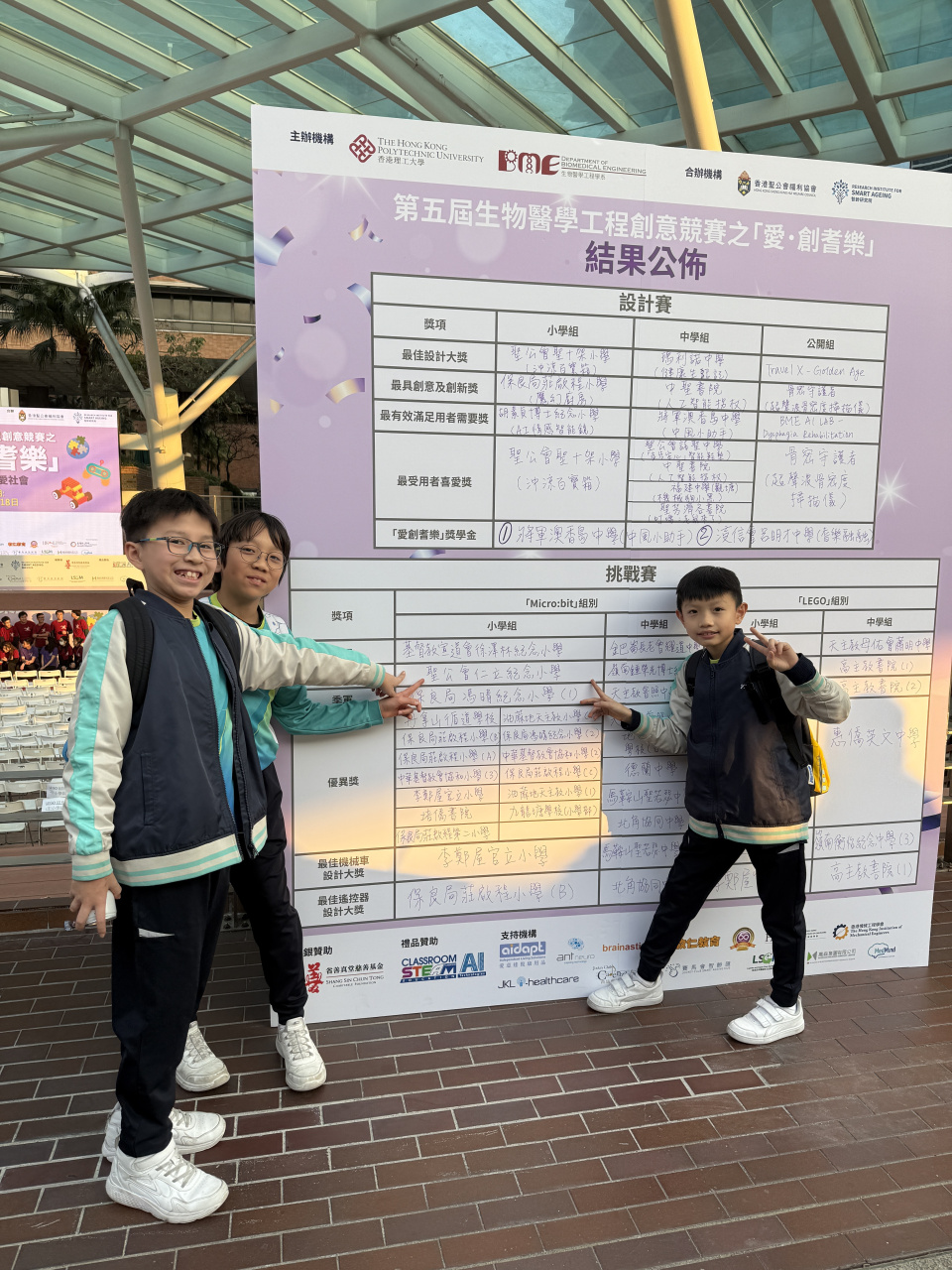 本校4位同學於2025年1月參加由香港理工大學生物醫學工程學系主辦、香港聖公會福利協會合辦的 第5屆「愛.創耆樂」 機械人比賽,組隊和老人家合作競賽,經過多次事前準備的練習及工作坊後,比賽當天經歷若干場淘汰賽,最後勇奪Microbit小學組亞軍,實至名歸。